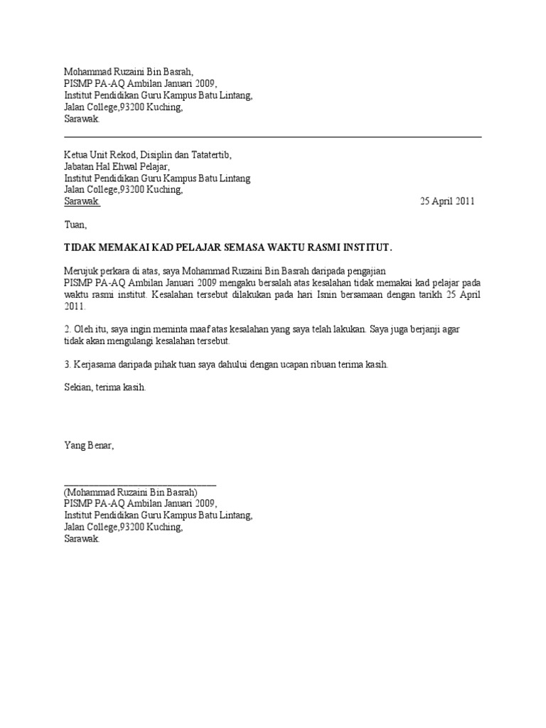Saya nurul syuhadah bt nazzir. Saya memimta maaf kepada bapak dan ibu guru atas kesalahan saya yaitu mencontek saat ujian. Meskipun di sini terdapat contoh surat rasmi untuk rujukan tetapi berkemungkinan ada di antara anda yang menginginkan sesuatu yang lebih spesifik.